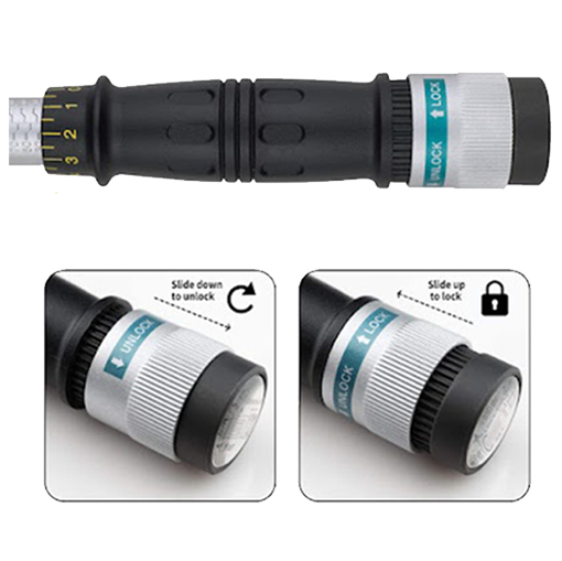 It has a push-through drive and a positive sliding locking mechanism. With the easy-read scale, the adjustable wrench takes the guesswork out of tightening. There’s a loud audible click at the torque point when it reaches the desired setting, to minimize the risk of overtightening.